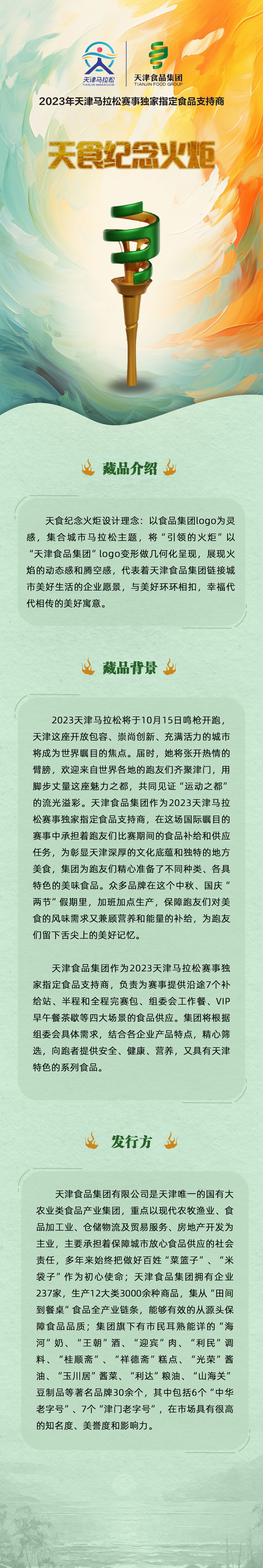 注:“2023天津马拉松赛事天津食品集团纪念火炬”数字藏品只面向参赛运动员免费限量发放,不在互联网上进行销售。参加半马和全马的运动员完赛后,可在终点处天津食品集团展位扫描现场二维码申领,数量有限,先到先得。