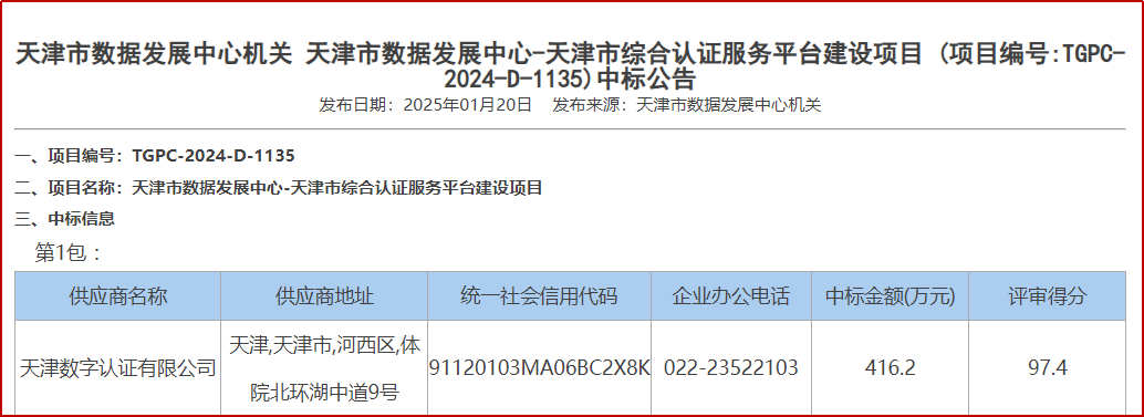 近日,津投资本所属天津数字经济产业集团有限公司(以下简称“天数集团”)旗下天津市天科数创科技股份有限公司(以下简称“天科数创”)与天津数字认证有限公司(以下简称“天津CA”)捷报频传,分别中标“天津市审计局智慧治理平台项目”及“天津市综合认证服务平台建设项目”,数智赋能天津市政府数字化转型发展。